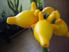 当初、上の方の実はまだ緑色でしたが、水を入れない花瓶に挿したまま約3ヶ月於いた今では、全部の実が黄色く熟し、今なお私たちの目を楽しませてくれています。