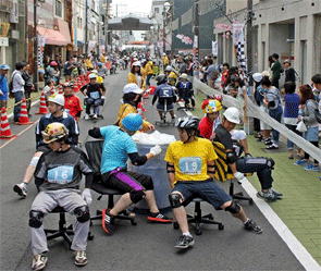 日本事務いすレース協会が主催していて、どんな過酷な状況下においても決してあきらめない大人の背中を子供たちに見せる事を通じ、青少年の健全育成と地域活性化を目的とする、内容と相反して趣旨は大真面目な大会なのです。