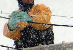 今シーズン一番の大雪の中、東北電力傘下のYurtecの高所作業車上で電線にカラス忌避線を巻き付けてくれました。