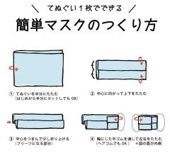 わたしが買い置きのマスクが無くなったら使おうと思っているのが、手ぬぐいを使った縫わないマスク。手ぬぐい販売の「かまわぬ」さんのサイトで紹介されています。
