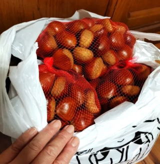 袋(と言うか赤いネット)を受け取り、拾った栗をこれに入れて、退園する時に拾った分の代金を払います。